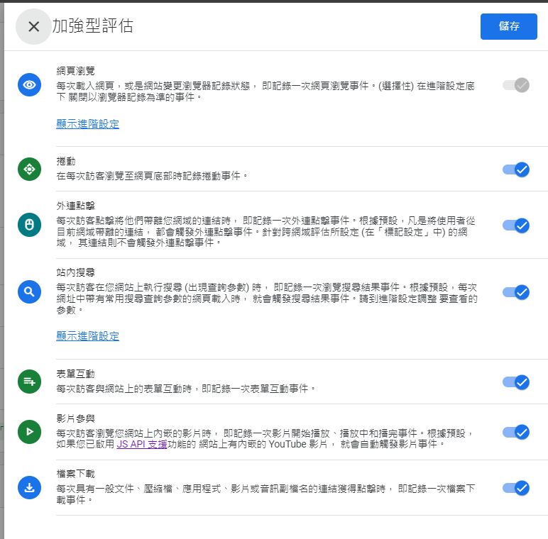 上圖為GA4的加強型評估, 當你使用GTM與GA4串接後 ,就會有的基本資料收集功能,所以也應該要避免你後續在GTM設定不管是轉換事件、自訂事件,盡可能跟以上的加強型評估區隔開來,或是將加強型評估的事件關閉。