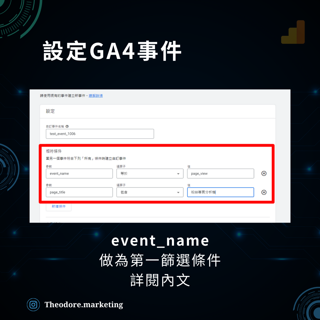 - event_name:接收到的事件名稱 參數1:page_view 藉由此設定,確保事件只有在新的頁面瀏覽(PV事件產生) 產生新的事件,避免事件重複傳送。