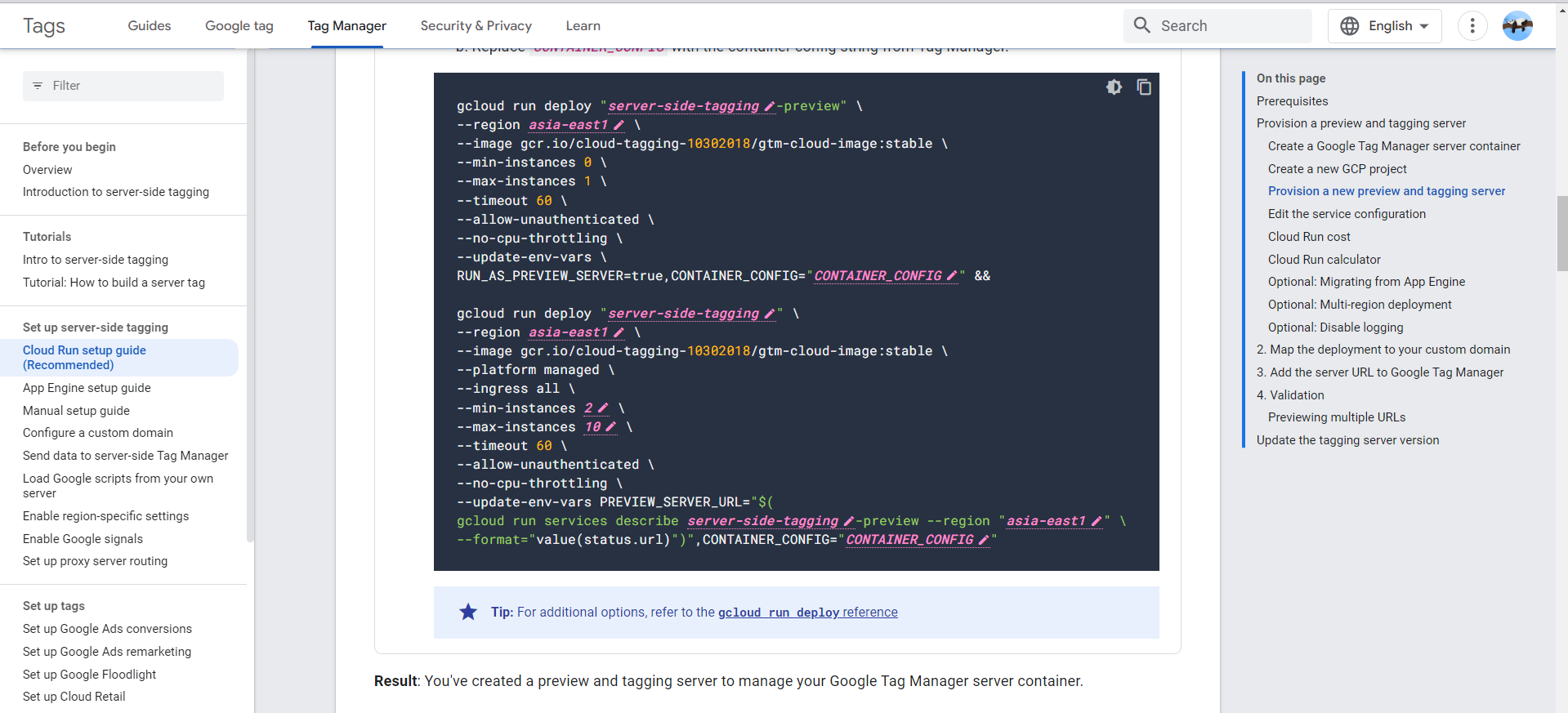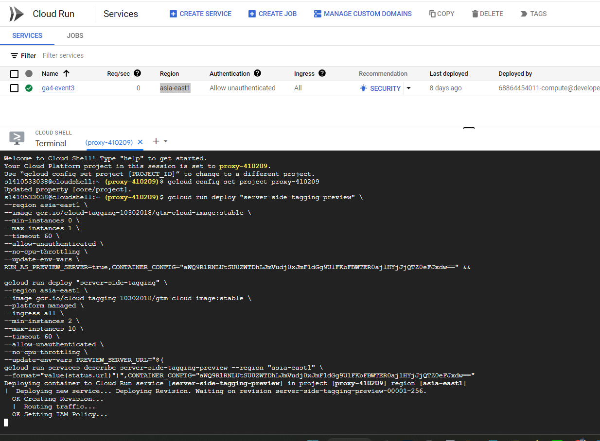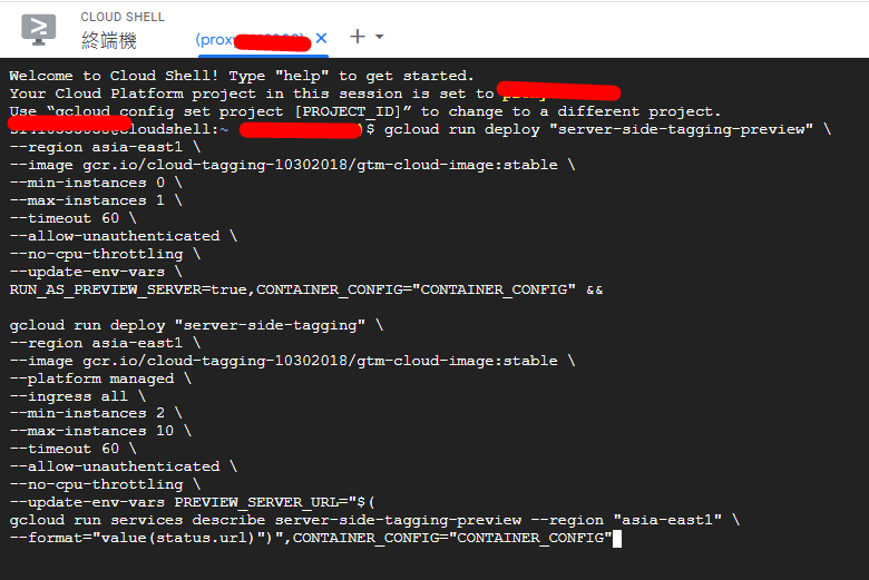 gcloud run deploy "server-side-tagging-preview" \ 這個為GTM-SERVER DEBUG模式使用 --region REGION \ 輸入你的伺服器地區 --image gcr.io/cloud-tagging-10302018/gtm-cloud-image:stable \ --min-instances 0 \ 輸入你需要的最小伺服器個體 --max-instances 1 \ 輸入你需要的最大伺服器個體 --timeout 60 \ --allow-unauthenticated \ --no-cpu-throttling \ --update-env-vars \ RUN_AS_PREVIEW_SERVER=true,CONTAINER_CONFIG="CONTAINER_CONFIG" && \\貼上GTM的CONFIG代碼 gcloud run deploy "server-side-tagging" \ 這個為GTM-SERVER 生產(上線)模式使用 --region REGION \ 輸入你的上線網站地區 --image gcr.io/cloud-tagging-10302018/gtm-cloud-image:stable \ --platform managed \ --ingress all \ --min-instances 2 \ 輸入你需要的最小伺服器個體 --max-instances 10 \ 輸入你需要的最大伺服器個體 --timeout 60 \ --allow-unauthenticated \ --no-cpu-throttling \ --update-env-vars PREVIEW_SERVER_URL="$( gcloud run services describe server-side-tagging-preview --region "REGION" \ --format="value(status.url)")",CONTAINER_CONFIG="CONTAINER_CONFIG" \\貼上GTM的CONFIG代碼 以上是你需要接續寫入的Comand Line,有中文註記的"務必" 把中文拿掉。另外改上你對應的數字,其他的基本上不需要改,直接貼近去給Cloud Shell即可。