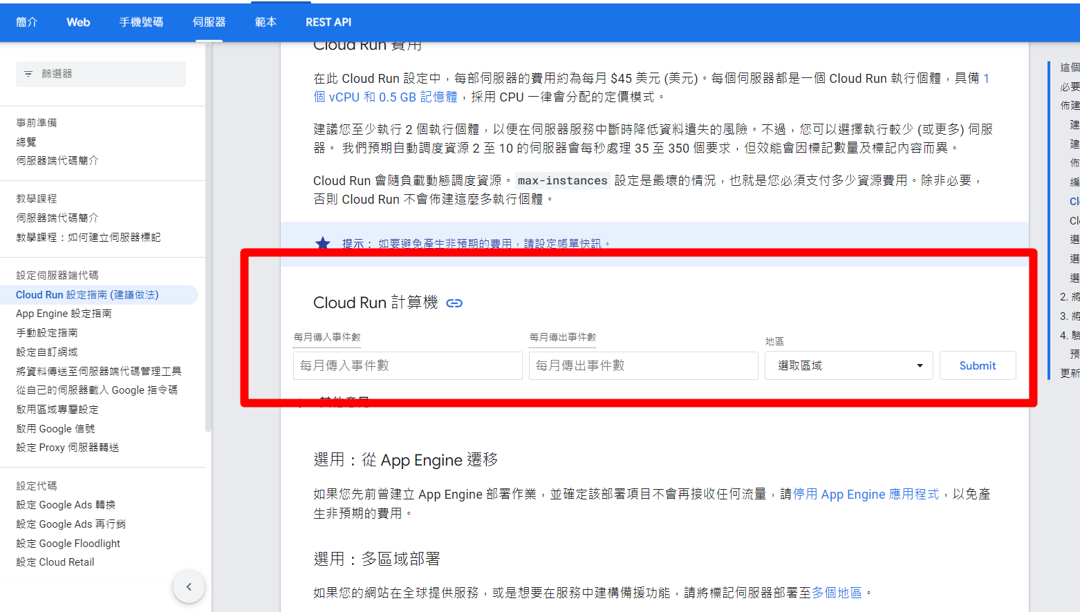 如果你要計算GCP部署的CLOUD RUN費用,你也可以點這個連結,自行預估每月發送的事件數。