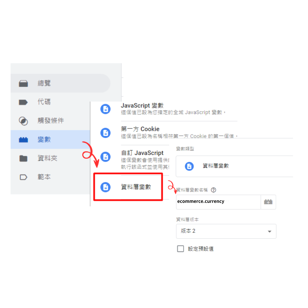 透過「GTM選單」的變數,點選「資料層變數」,輸入對應的資料層(DLV)。如果你想要抓取「currency」。