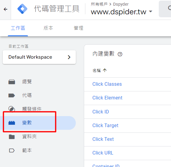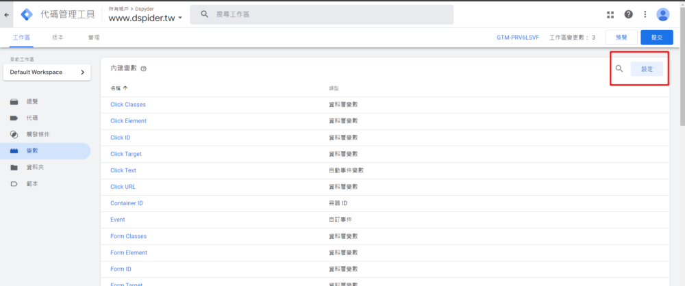本篇要講GTM常用內建變數:中譯+功能解說。 變數的位置在哪邊 打開你的clien容器,並點選左邊選單的「變數」。 點選右上角,紅框處的設定。打開後就會看到待會要講解的全部變數中譯+功能解說。 變數的實際位置。 網頁類 Page URL:當前瀏覽器網址 Page Hostname:當前瀏覽器網址的主機名稱 Page Path:當前瀏覽器網址路徑 Referrer:當前瀏覽網頁的上一網域 點擊類 Click Element:回傳點擊元件Dom選擇器 Click Classes:點擊元件的類別屬性值 Click ID:點擊元件的ID屬性值 Click Target:點擊元件的Target屬性值