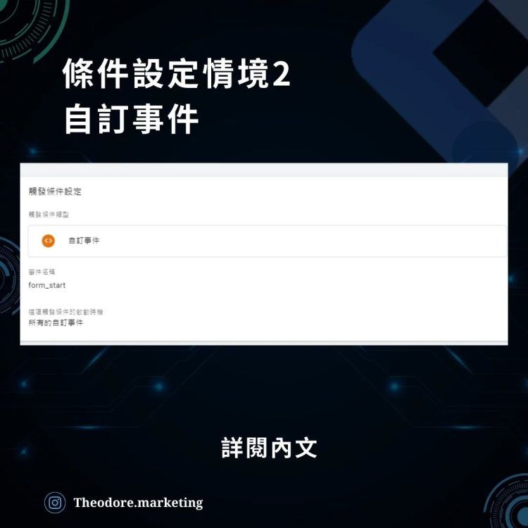 設定條件: 選擇「自訂事件」,事件名稱為「formstart」,再選擇所有自訂事件。 請參考範例圖。