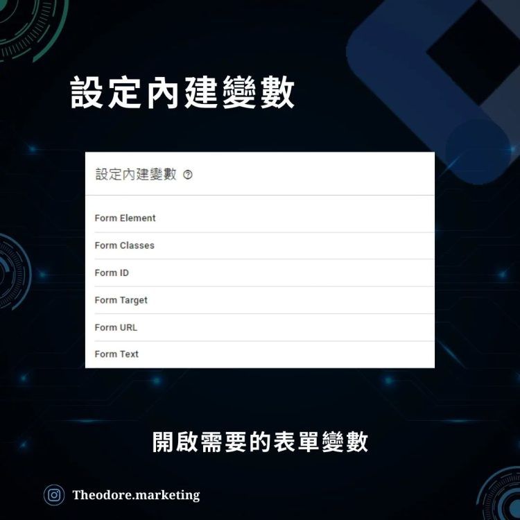 GTM首頁左邊的選單列,點選「變數」。並在內建變數中點選設定。找到「表單」可以將全部開啟,也可以開啟用得到的變數即可。