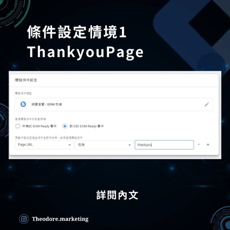 設定條件: 選擇「網頁瀏覽 – DOM就緒」,部分的DOM,並且選擇PAGE URL包含「thankyou」。 請參考範例圖。