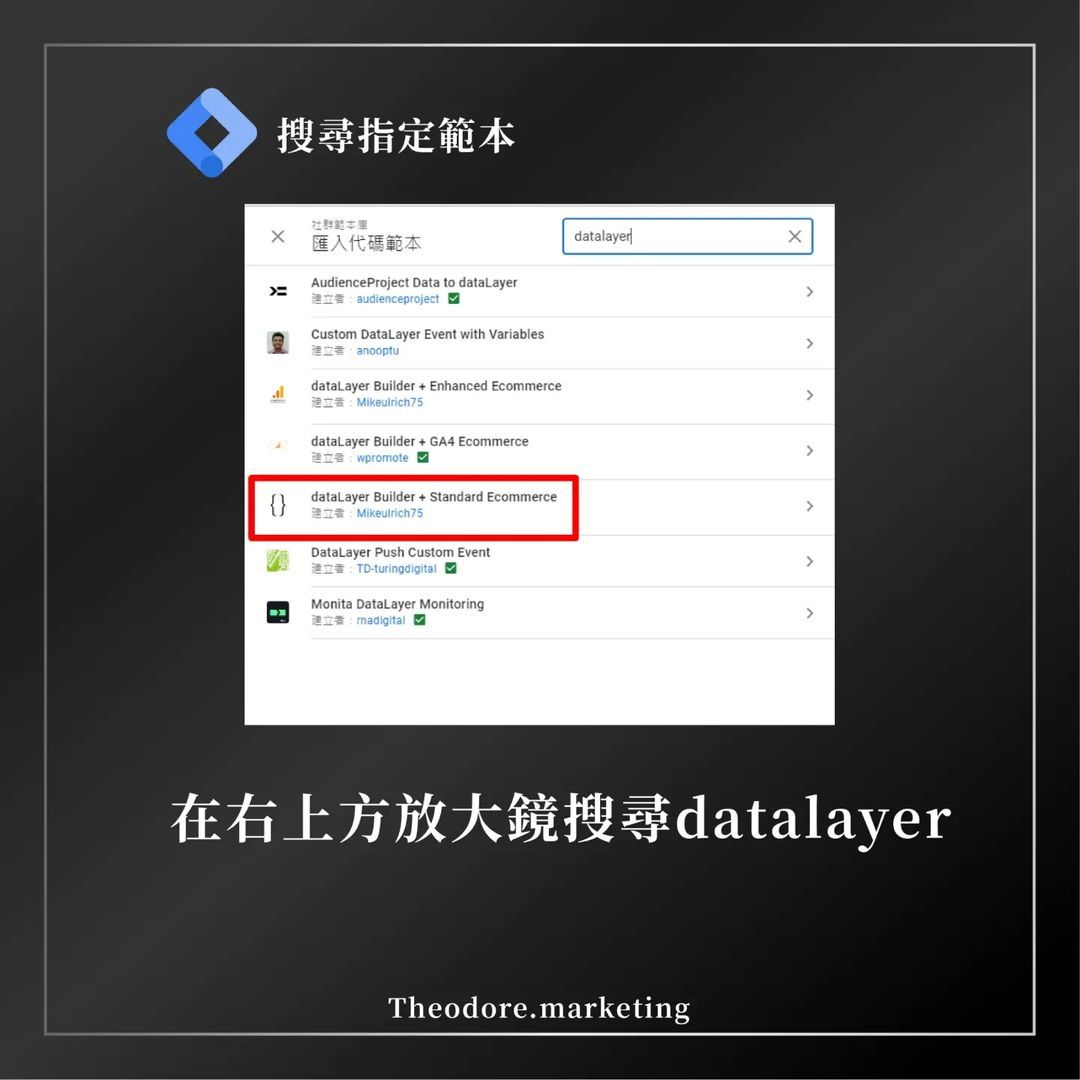 開啟範本選單後,在右上方放大鏡搜尋datalayer,並找到我所貼的範本「dayaLayer Builder + Standard Ecommerce」。
