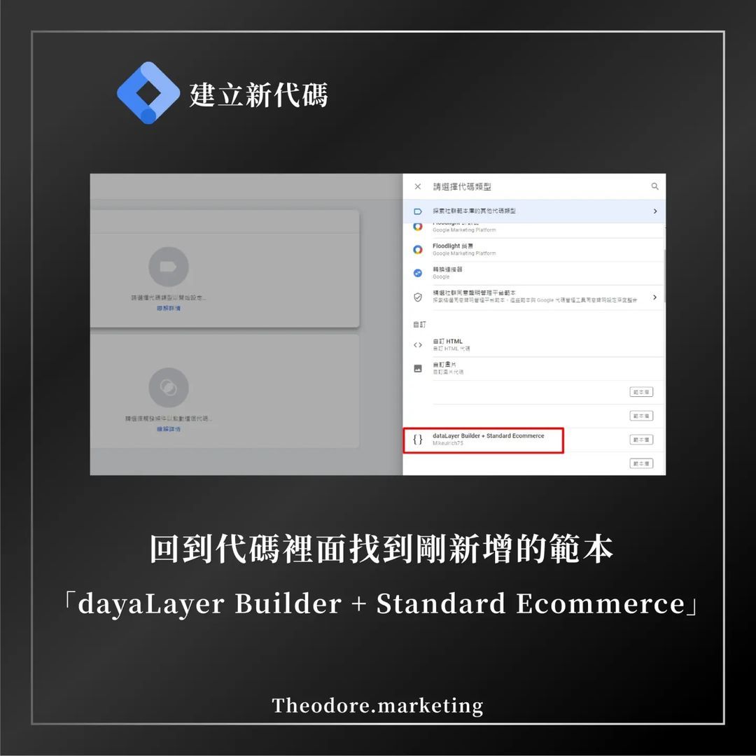回到左邊選單區,點選新代碼,並找到剛剛新增的範本「dayaLayer Builder + Standard Ecommerce」。