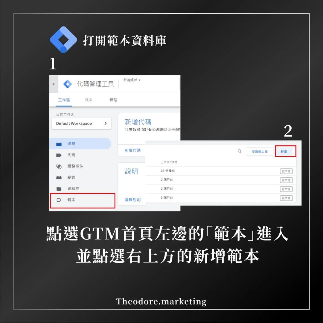 點選GTM首頁左邊的「範本」進入,並點選右上方的新增範本。