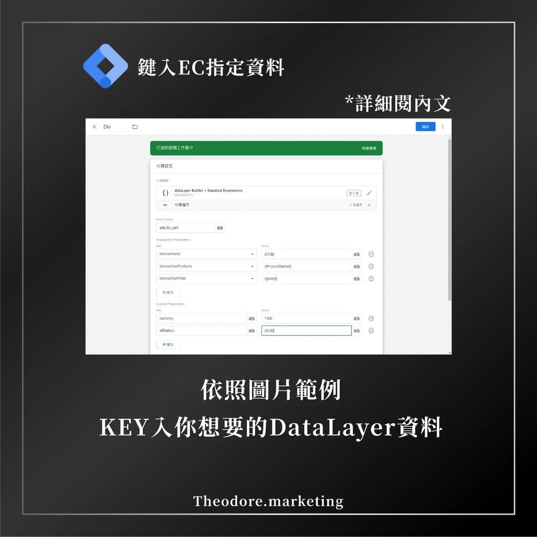 Transaction Parameters的維度,有些並不符合官方文件要的資料,所以我個人會建議用Custom的維度,並參照官方文件進行埋設。其實我覺得這一個步驟有很多種用法,我習慣用這一個範本,push想要的DLV,再用變數抓取出來,放到其他事件中。傳送Transaction ID, CID 這邊基本上也可以直接辦到。
