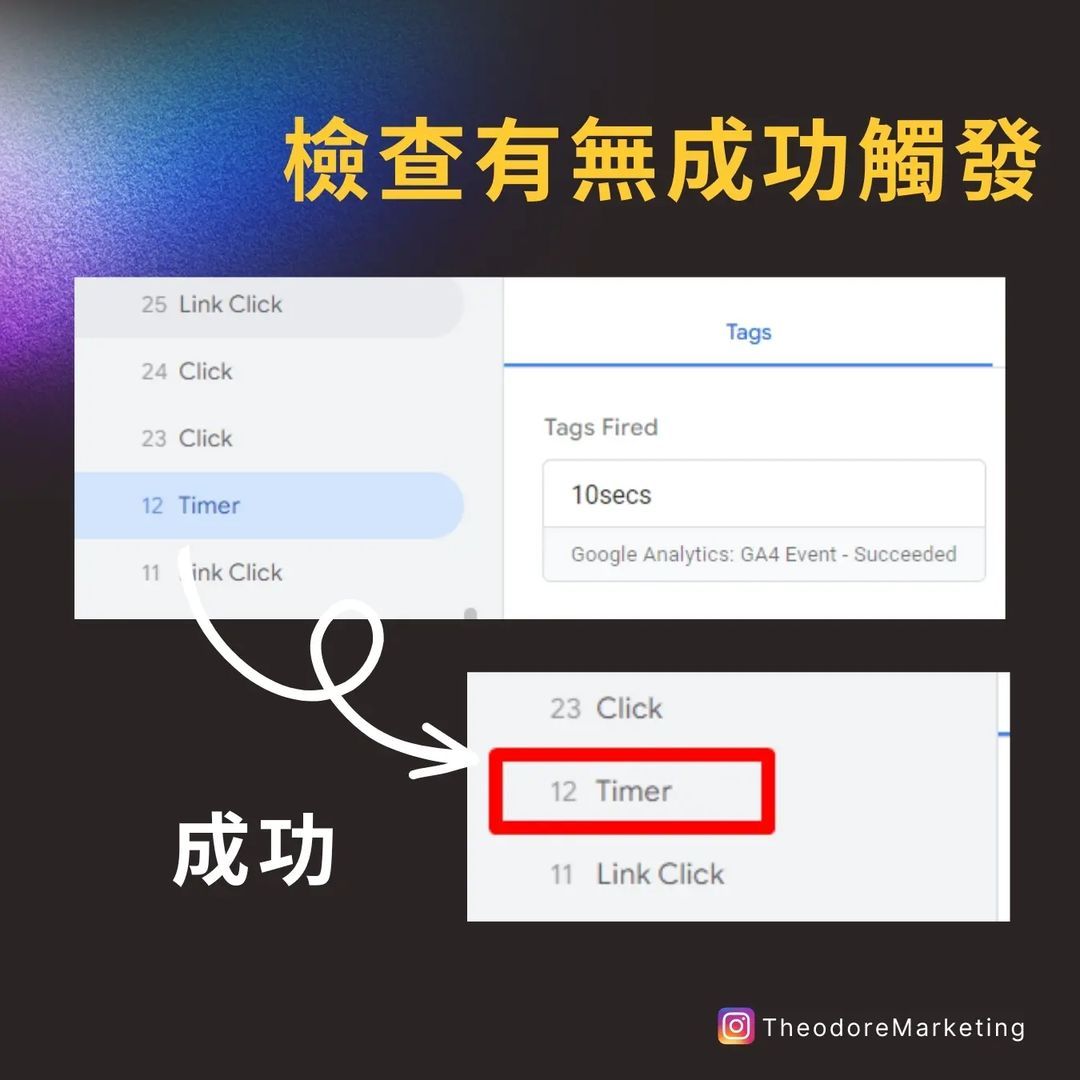 可以看到Debug模式中,已經有多出一個TIMER的事件。TAG FIRED也成功觸發我剛所設定的事件。即完成,可以回到GTM首頁,並且發佈出去。