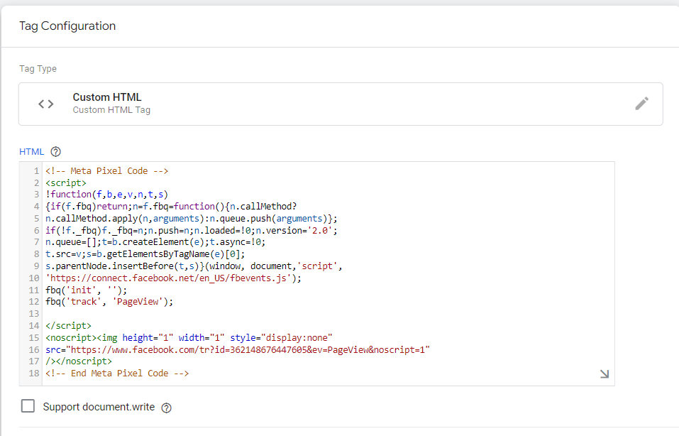 如果你是喜歡用上一個段落「透過臉書範本」進行埋設,那這一個段落你就可以跳過,因為兩個目的都是傳送事件給臉書,只是代碼的設定不同。透過自訂html你需要埋設初始代碼 (init),再加上你要的事件。基礎代碼GTM中,一個pixel只會放一個init,而事件則是看你有幾個事件,就創造幾個自訂html進行追蹤。