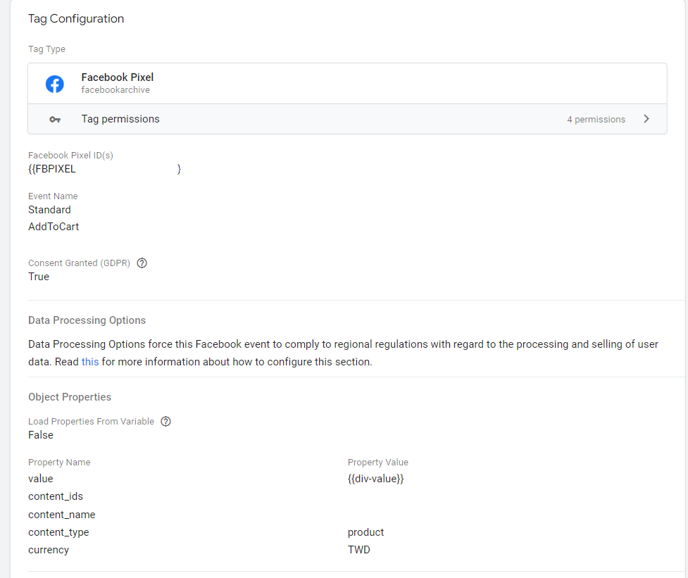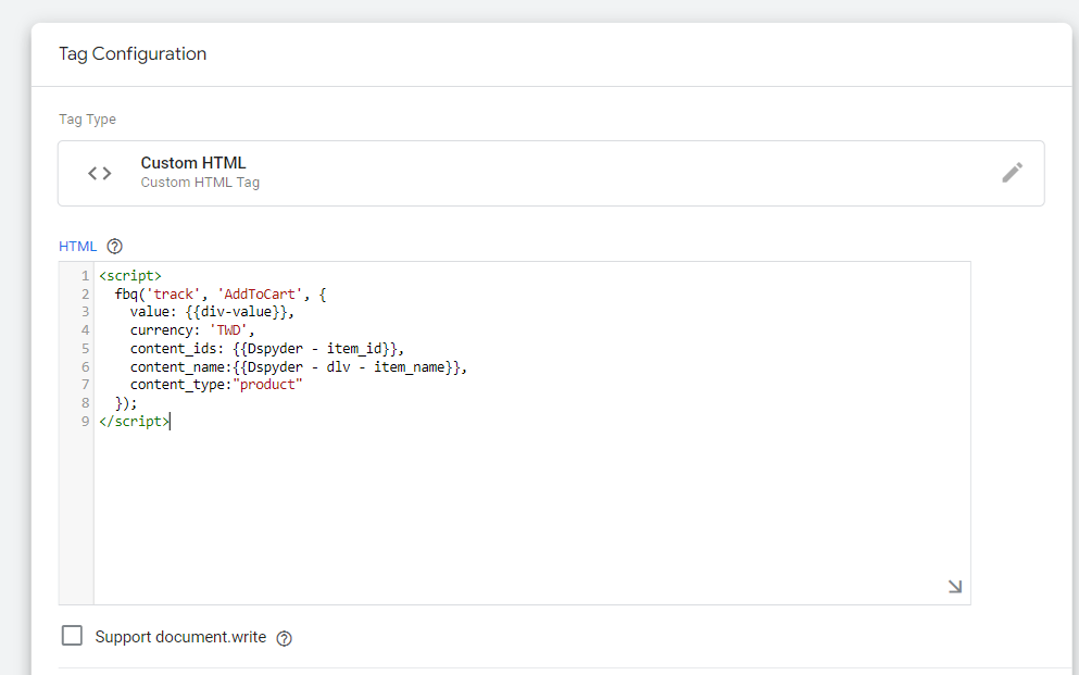 <script> fbq('track', 'AddToCart', { value: {{div-value}}, currency: 'TWD', content_ids: {{Dspyder - item_id}}, content_name:{{Dspyder - dlv - item_name}}, content_type:"product" }); </script> 如果你是要追蹤購買事件,只需要把上方的「AddToCart」,換成「Purchase」即可。其他的物件陣列參數,都需要你額外透過網站前端的回傳,可以用上面的寫法, 如果你不知道怎麼抓取網站前端的事件金額,歡迎參閱。