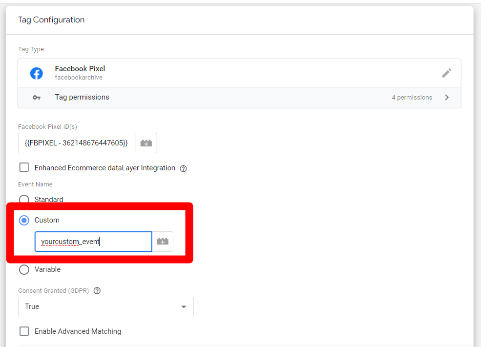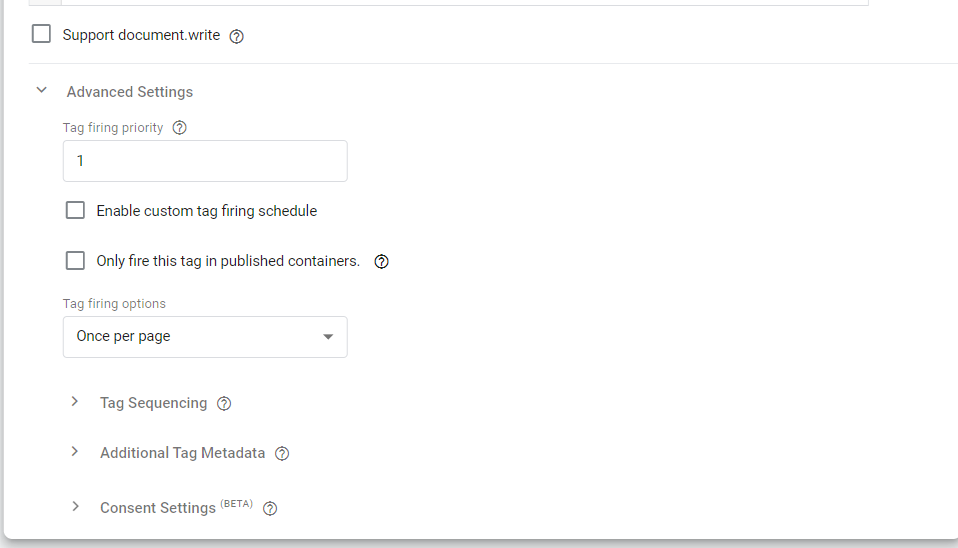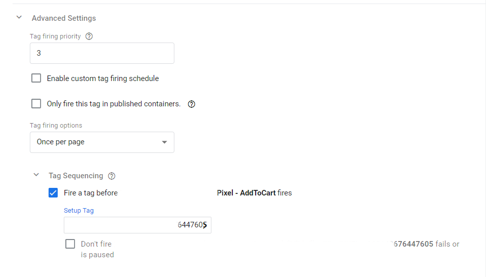 如果你設定的網站有多個pixel同時運行追蹤,你一定要確保你自己的init是在事件觸發的前面。因此建議Tag Sequensing這邊可以在自訂事件前面觸發init確保正確的流程順序不會跑掉。而最上面的Tag Firing Priority則是適用調整自己的代碼順序,數字越小越優先觸發,適合使用在有多個Pixel並行追蹤。