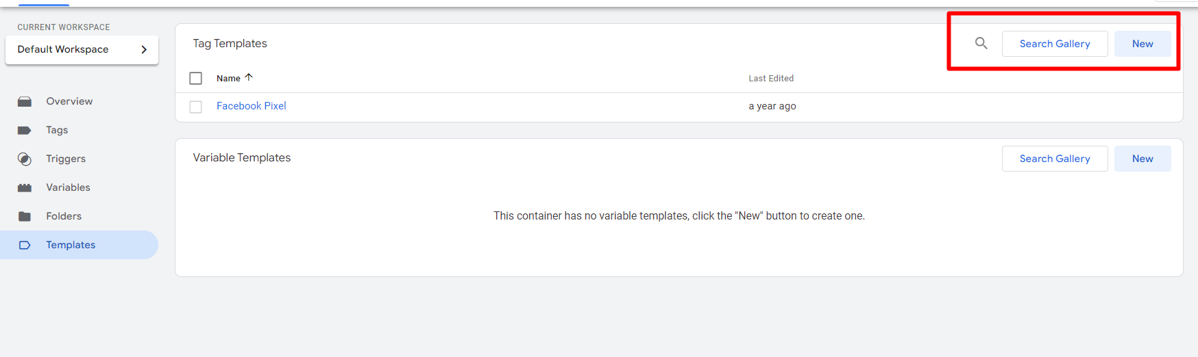 前往GTM(client容器),點選範本,並且點選右上角的Search Gallery (搜尋範本庫)。
