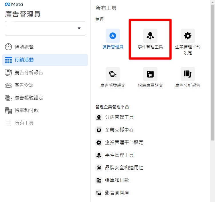 至企業管理平台中的選單, 找到「事件管理工具」 。如果你沒有企業管理平台,是否有下過廣告? 如果有你一樣可以從「廣告管理員」找到上圖位置。
