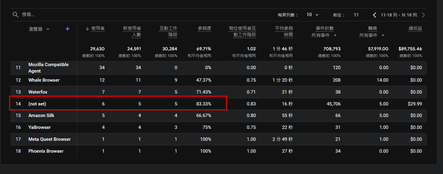 GA4裡面的技術詳情:瀏覽器,為甚麼會有not set? 回到我最一開始的原理去推測,瀏覽器這裡的資料是由當使用者的瀏覽器進入網站後,他會告知對方伺服器他的user-agent,user-agent帶有使用者目前使用的瀏覽器。因此not set就表示當使用者再請求瀏覽器時,可能因為 外掛插件、隱私設定導致瀏覽器將user-agent沒有發送出去 。