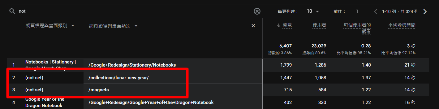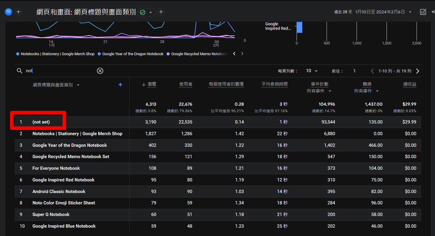 如果你想知道是哪一頁page_title可能有問題,你可以打開另外一個維度,並選擇「網頁路徑/畫面類別」,查看是在哪一個頁面路徑,再去由網站工程師查看該頁的原始碼哪裡有問題。