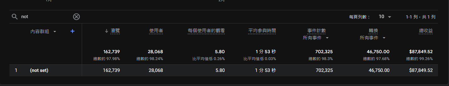 內容群組如果你一開始都沒有設定,那他就是沒有東西(not set),因為這一個維度是用來安排網站不同頁面群組的,比如網媒站底下的分類 - 健康、運動、政治、社會...等,就可以使用。