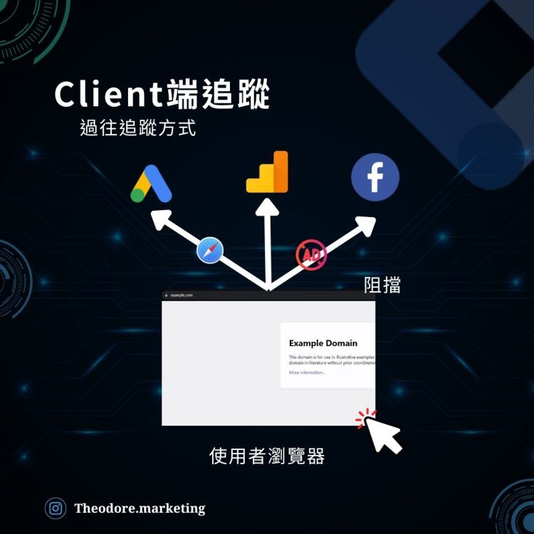 原本的Client端追蹤,都是直接透過使用者的瀏覽器,發送請求至第三方追蹤工具,例如GA4, FB Pixel,但隨著IOS更新政策,Adblocker的頻繁使用,導致這些追蹤的資料,越來越難被成功發送至第三方追蹤工具。