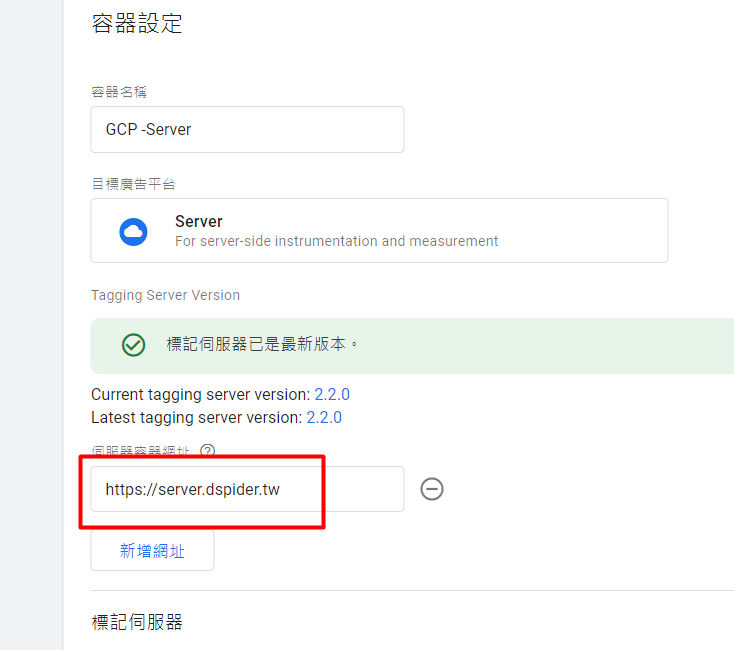 修改GTM-SERVER容器所使用的伺服器網址,貼上你的自訂網域在紅框處。