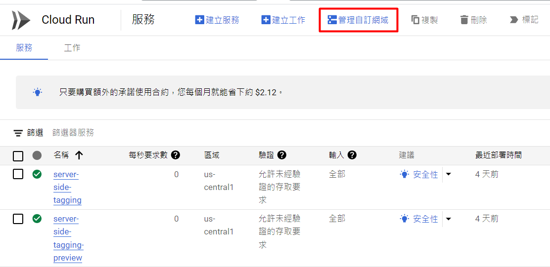 接續第一個步驟,你點開CLOUD RUN後,你會看到有兩個服務正在進行中,這兩個都是GTM幫我們自動部署的服務。我們主要會依照字尾沒有「preview」的來做設定。