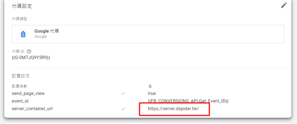 修改GTM-Client容器的Google代碼,裡面的配置參數。在上方紅框處中,換上你剛剛設定的自訂網域。