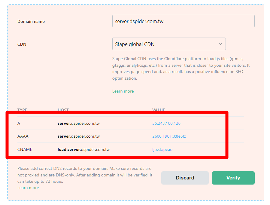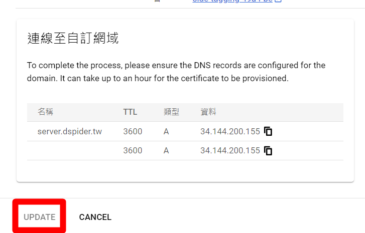 上圖為,我在網域管理設定的DNS紀錄,名稱、類型、值,基本上對應GCP/STAPE給你的東西去設定即可!