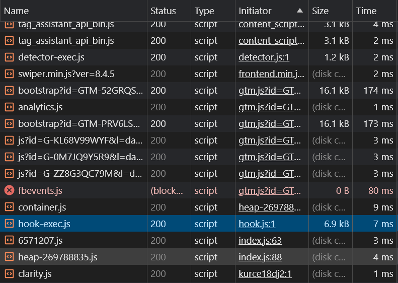 像下面這一張圖,臉書像素就是被AdBlocker封鎖請求 (影響廣告成效)。