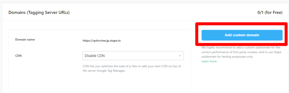 在上一個進入STAPE的SERVER容器後,你往下滑會看到這一個藍色按鈕「Add Custom Domain」,點選他。