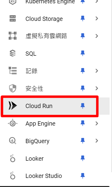 並且點選左上角的菜單,找到一個「CloudRun」,裡面就是GTM自動部署所使用的服務,待會也會看到有兩個服務正在運行。
