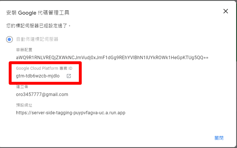 你也可以透過點選GTM-SERVER旁邊的ID,點開後你會看到GCP的專案ID,旁邊有超連結可以直接前往GCP網站,跟上一個步驟都一樣,只是進入的方式不同。