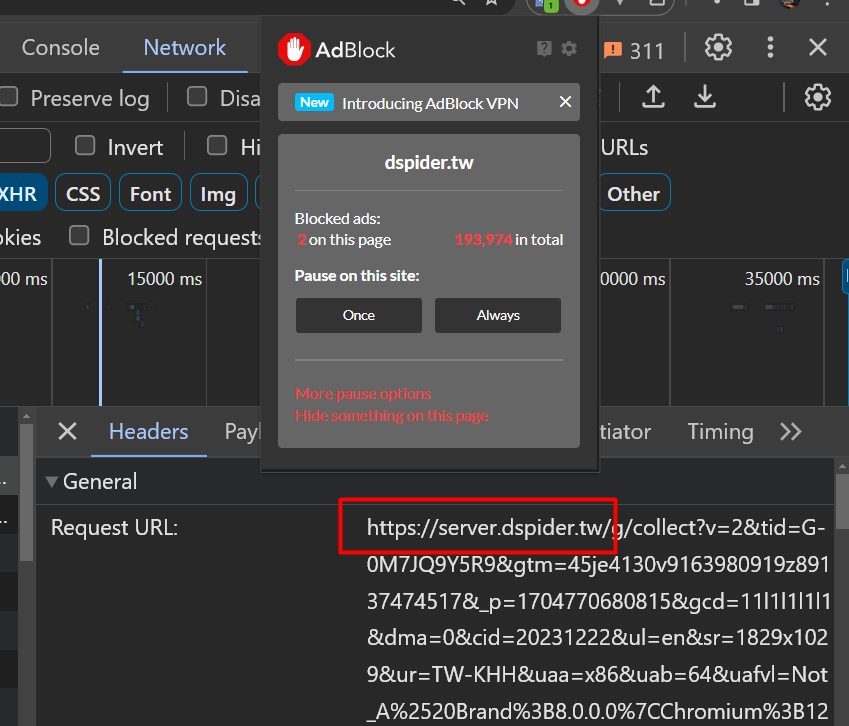 可以直接從前端F12查看,瀏覽器正在使用我設定的自訂網域傳送GA4事件,另外在我廣告阻擋器有開的狀況下,依然還是有在進行事件的發送。
