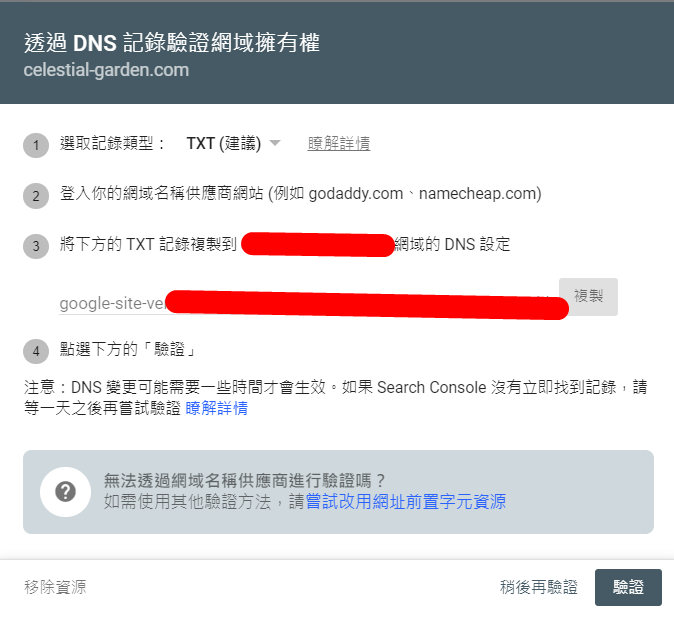 如果你是有在經營SEO的,那這個步驟會很快就驗證完畢,如果你都沒有SEO,那就走一次GSC驗證的流程即可。完成後,你需要等待前面那一張圖的設定執行一下,時間約2-3個小時左右。
