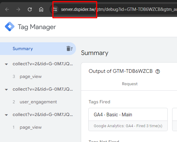 前面的步驟都已經設定好後,你可以前往GTM-SERVER的DEBUG模式查看,會發現URL已經使用剛剛的自訂URL。並且前端的事件,都有正常接收,恭喜你代表已經完成設定囉!