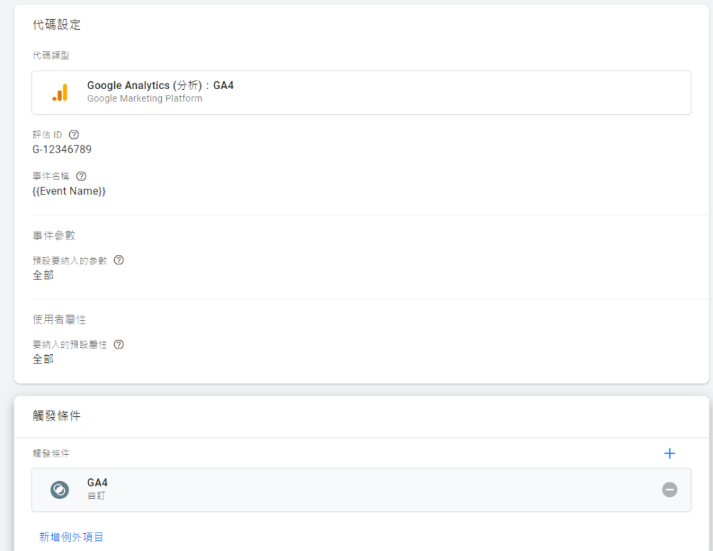 觸發條件本次範例選擇自訂,當然需要依照你前面代碼設定的事件做變動,不過基本上「自訂」,能幫我們處理絕大多數的情況了。