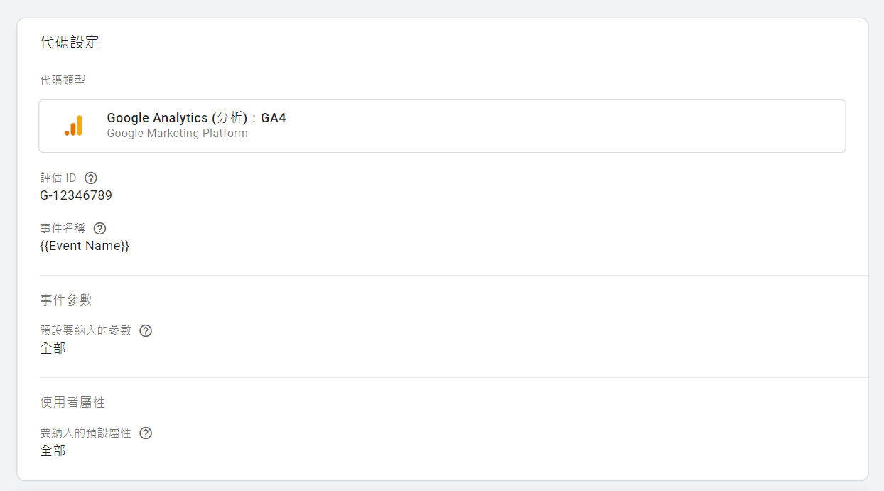 在你的GTM-Server容器新增一個「GA4的代碼」,並且填入你的GA4評估ID,以及事件名稱設定{{EventName}}。
