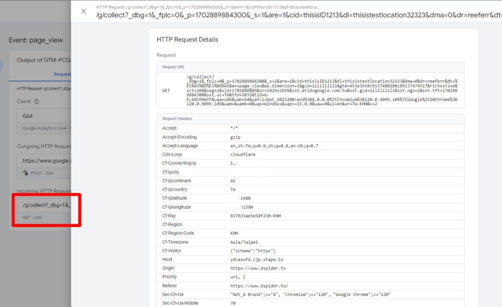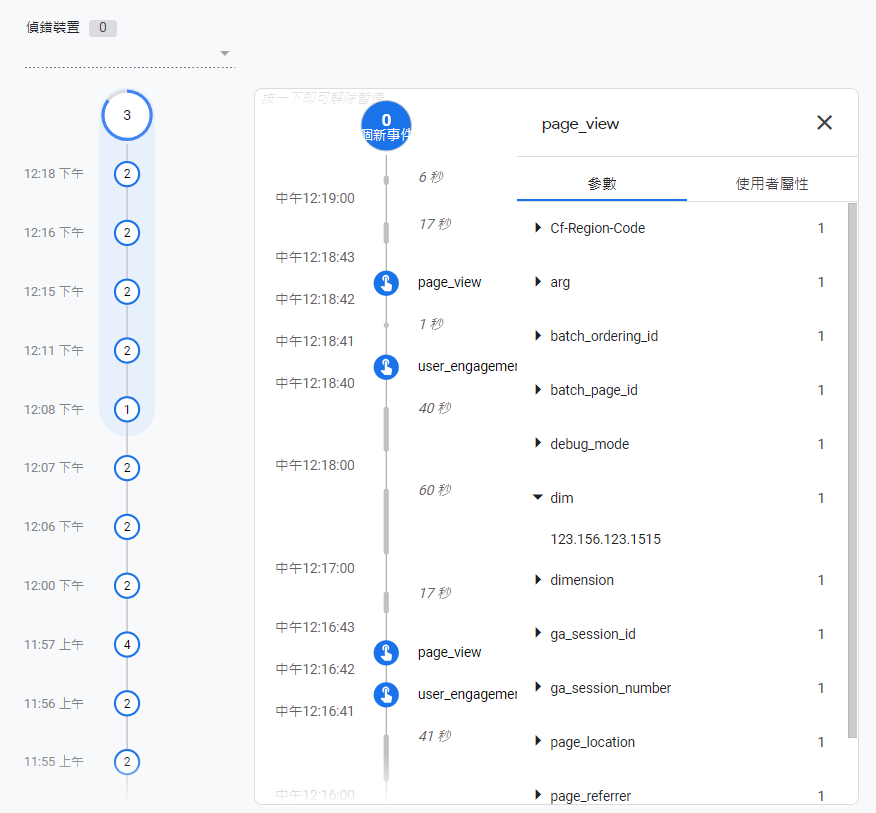 使用伺服器追蹤的好處,你可以在指定事件中,新增你要的自訂參數,例如上方「dim」,並且帶上我修改後的IP地址。