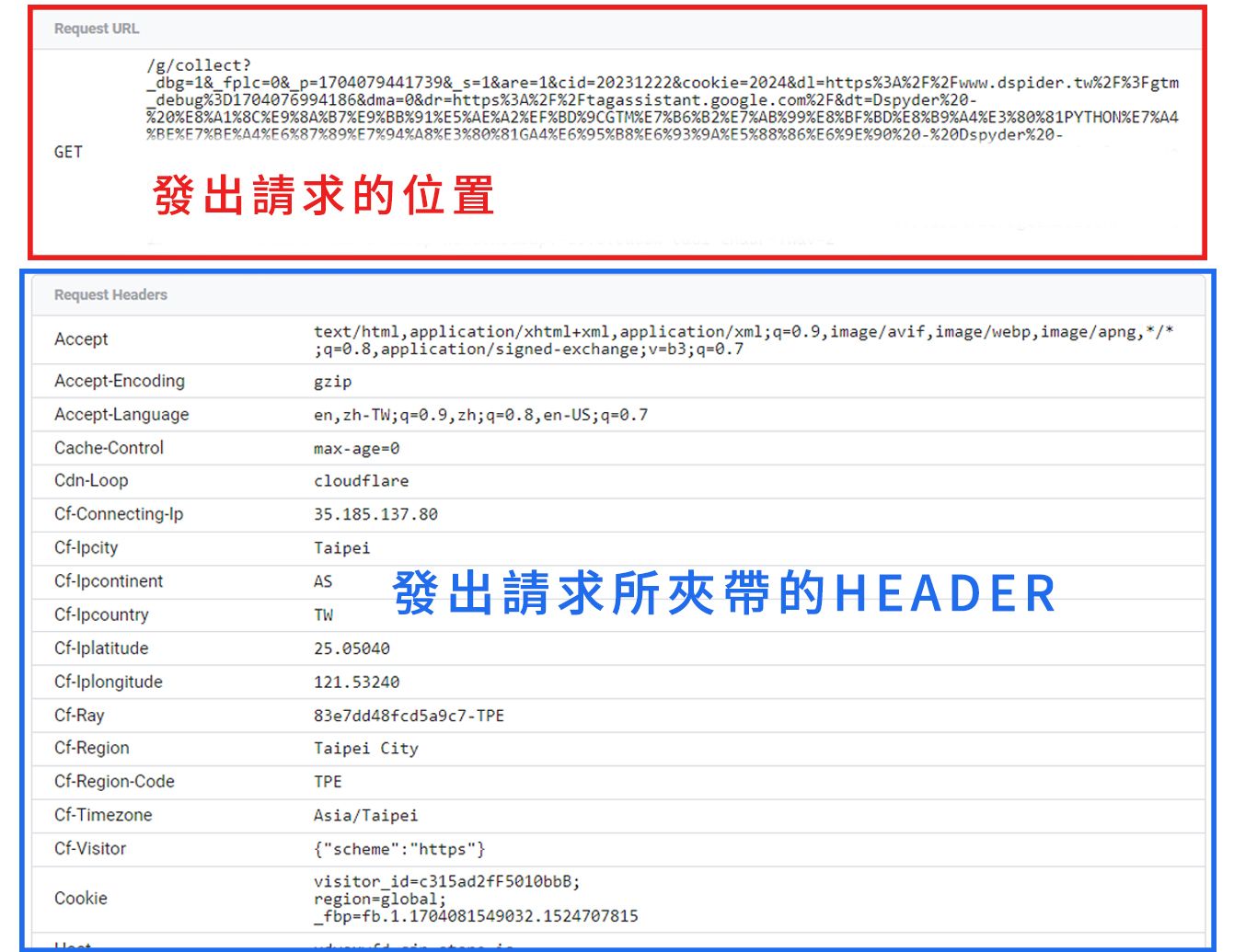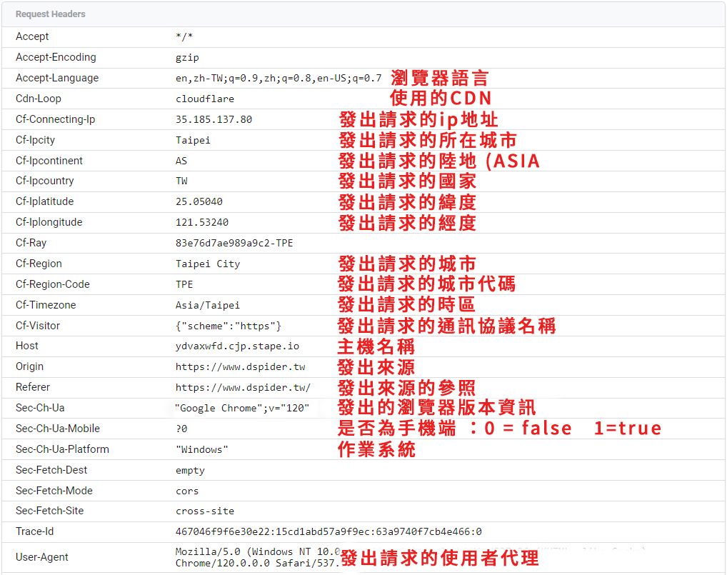 上面這一張圖,跟剛剛前一個主題的藍色框框是同樣的地方,只是我再把這張圖裡面的header抽出來,並挑選幾個你可能可以用得到的標頭名稱。 這些全部都可以在GTM實踐追蹤,並傳送資料出去。