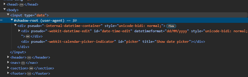 Shadow 的使用或許你也有用過,光是你在寫HTML的Input元素,光只是寫一行,為甚麼能帶出一整個選擇日期的欄位? 原來也是套用了Shadow DOM。